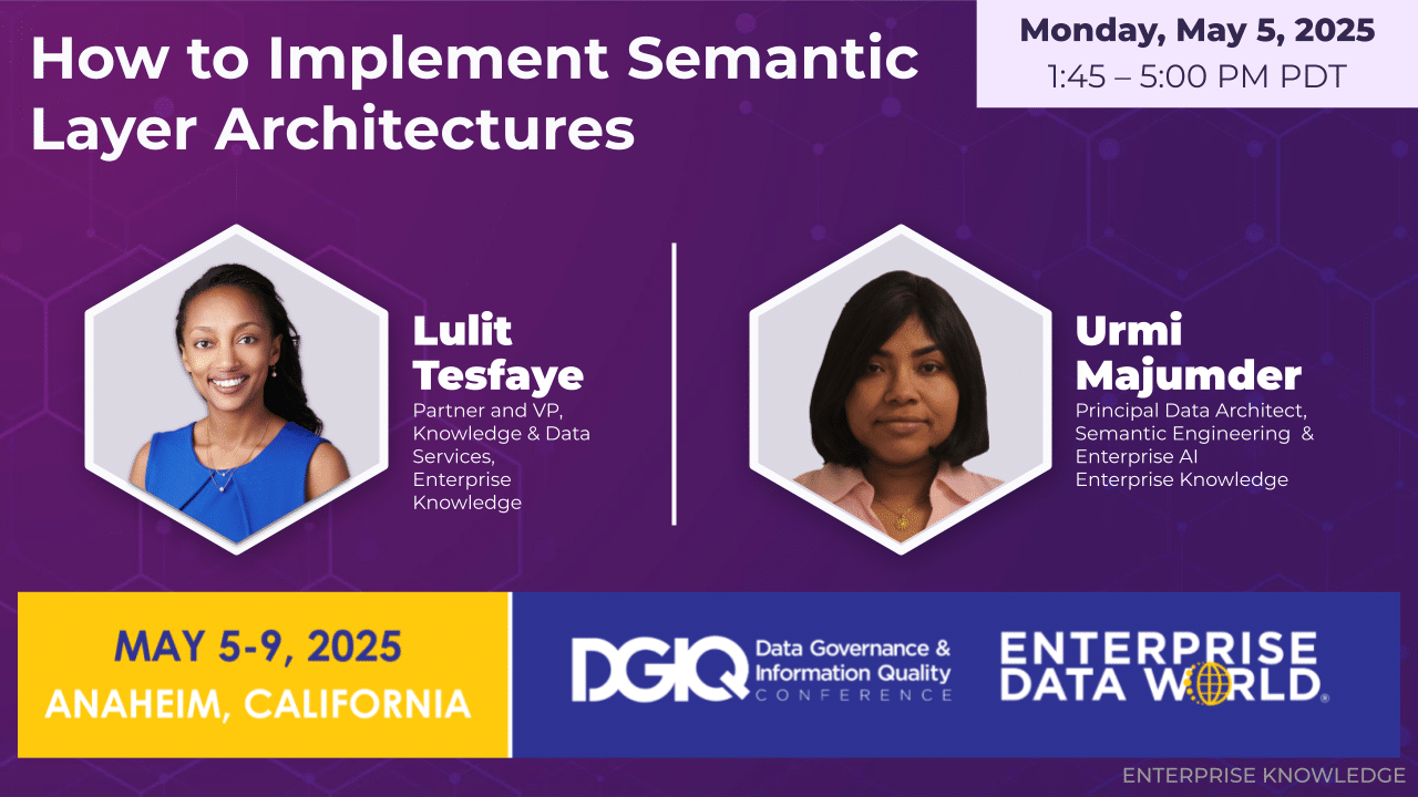 Enterprise Knowledge’s Lulit Tesfaye, Partner and Vice President of Knowledge and Data Services, and Urmi Majumder, Principal Data Architect, will deliver an in-depth tutorial on semantic layer architectures at the DGIQ West + EDW 2025 conference on May 5th.