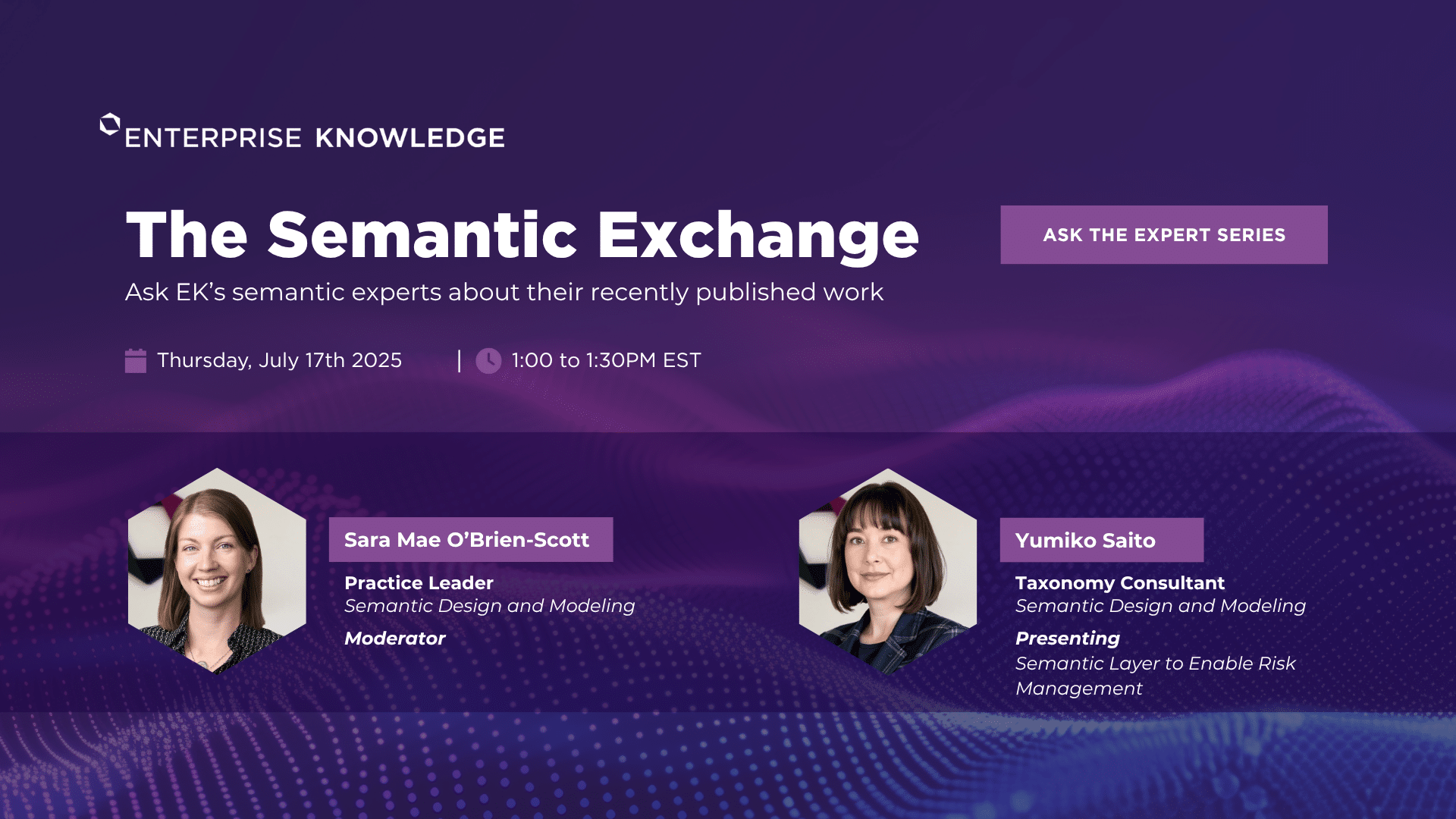 Enterprise Knowledge is continuing our new webinar series, The Semantic Exchange with the fourth session. This session is designed for a variety of audiences, ranging from those working in the semantic space as taxonomists or ontologists, to folks who are just starting to learn about structured data and content, and how they may fit into broader initiatives around artificial intelligence or knowledge graphs.