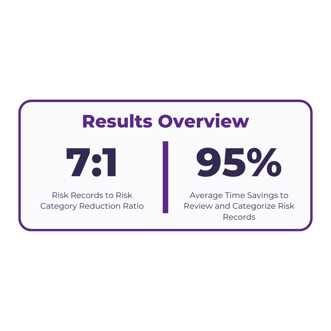 The human-in-the-loop taxonomy development further elevated the model-generated risk topics through expert reviews and categorizations. This process enabled the aggregation of about 10,000 yearly records into approximately 1,500 categories from the newly developed risk taxonomy. This aggregation reduced the time it took risk SMEs to review and categorize risk incidents from 45-50 minutes to 1-2 minutes per risk occurrence.