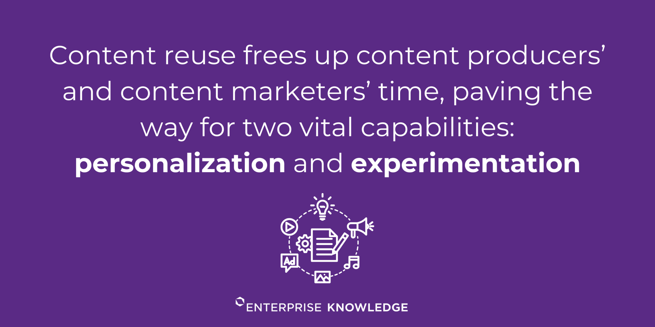 The same can be said for reusing and repurposing content. By using Structured Content Management and effective content reuse, you decrease the overhead associated with creating and managing content. This effectively enables more systematic ways to reuse content and frees up time for content producers to create new and interesting types of content. This results in both an increase in content and the opportunity to broaden your audience. Moreover, content reuse frees up content producers’ and content marketers’ time, paving the way for two vital capabilities: personalization and experimentation.