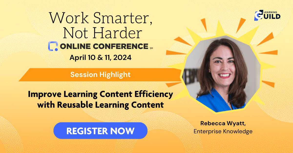 Rebecca Wyatt, Partner and Director for Enterprise Knowledge’s Advanced Content Team, and Emily Crockett, Content Engineering Consultant, will deliver a hands-on micro master class on “Improving Learning Content Efficiency with Reusable Learning Content” at The Learning Guild “Work Smarter, not Harder” online conference on Wednesday, April 10, at 2:30 PM EST/ 11:30 AM PST. Wyatt and Crockett will walk participants through the process of creating a reusable learning content model as well as best practices of dynamic content. The session will also explain how reusable content enables the personalization of the learning content to achieve optimal learning and performance outcomes, while ensuring consistency, accuracy, and efficiency.