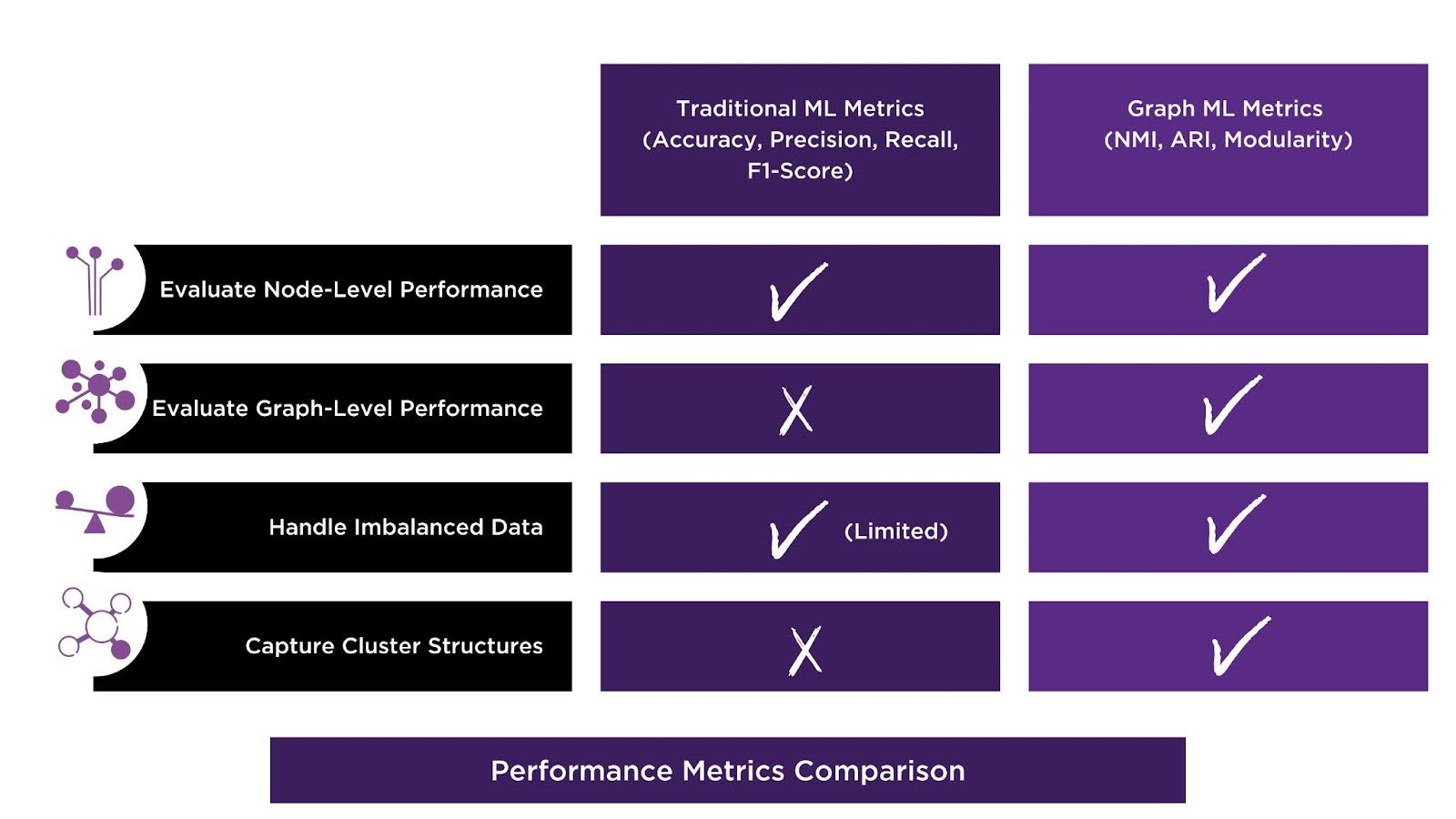 While common performance metrics apply broadly to most graph ML use cases, there are also specialized metrics for graph ML—such as Normalized Mutual Information (NMI), Adjusted Rand Index (ARI), and Modularity. Traditional ML evaluation metrics like accuracy or F1-score work well for independent data points, but they don’t fully capture the nuances of graph structures, such as community detection or link prediction. Graph-specific performance metrics provide a more nuanced evaluation of models, ensuring that the unique aspects of graph structures are effectively measured and optimized. When you are evaluating a graph ML model, you are able to determine model performance with enhanced structural awareness, contextual evaluation, and imbalanced data handling—areas where traditional ML metrics often fall short.